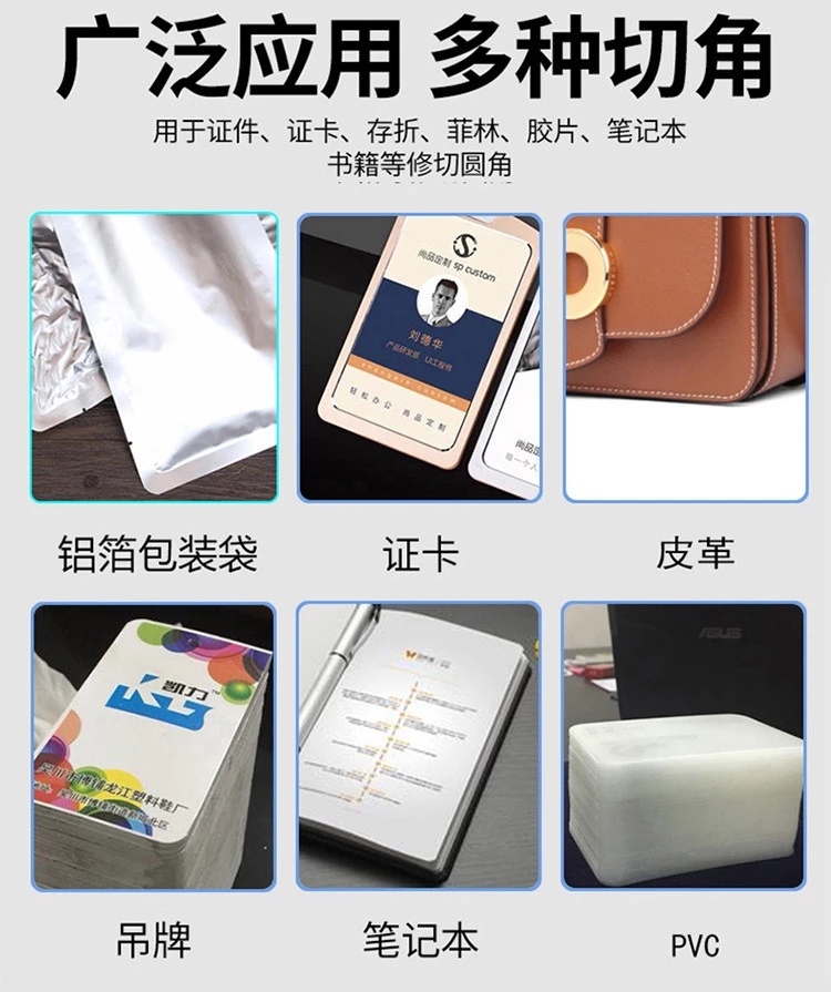 廣泛應(yīng)用多種切角,用于:證件、證卡、存折、菲林、膠片、筆記本、書(shū)籍、鋁箔包裝袋、皮革、吊牌、PVC等修切圓角。