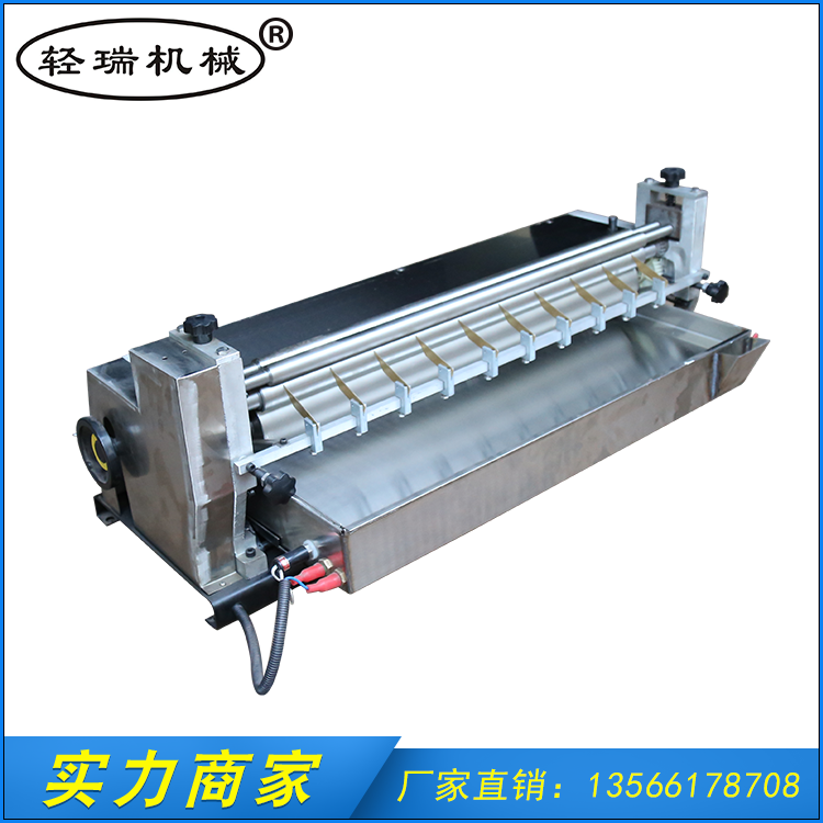 不銹鋼調(diào)速膠水機_臺式膠水機_過膠機_上膠機_白膠機結(jié)構(gòu):1.膠水盆裝卸把手 2.帶膠輥 3.上膠輥 4.壓紙輥5.壓紙輥調(diào)節(jié)把手 6.防護罩 7.電機調(diào)速旋鈕8.膠水盤 9.支架 10.手動手柄等部件組成。主要用于印刷精品盒及紙箱,是對薄紙、皮革、瓦楞紙過膠水的專用設備,同時也對各種纖維紙進行雙面/單面過膠。本機器傳動部位采用滾動軸承,膠水盤升降等結(jié)構(gòu),各軸采用全不銹鋼,適用不同厚度的紙張。因此使其外型精巧,性能穩(wěn)定,傳動靈敏,噪音小,生產(chǎn)效率高、勞動強度低等優(yōu)點。不銹鋼調(diào)速臺式膠水機裱紙寬度有600MM、720MM??砂串a(chǎn)品需要加裝調(diào)速器。其它規(guī)格可訂做。