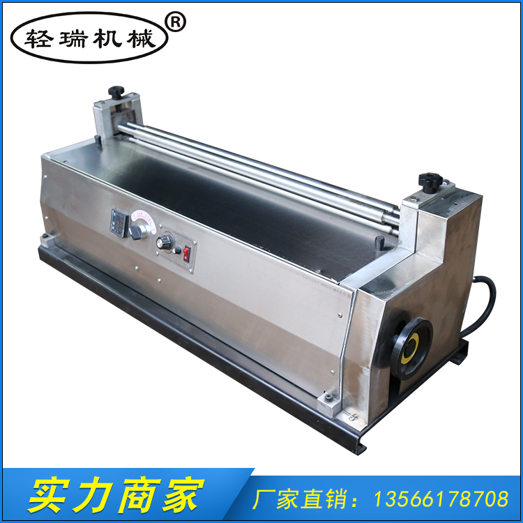 不銹鋼調(diào)速膠水機(jī)_臺(tái)式膠水機(jī)_過(guò)膠機(jī)_上膠機(jī)_白膠機(jī)結(jié)構(gòu):1.膠水盆裝卸把手 2.帶膠輥 3.上膠輥 4.壓紙輥5.壓紙輥調(diào)節(jié)把手 6.防護(hù)罩 7.電機(jī)調(diào)速旋鈕8.膠水盤(pán) 9.支架 10.手動(dòng)手柄等部件組成。主要用于印刷精品盒及紙箱,是對(duì)薄紙、皮革、瓦楞紙過(guò)膠水的專用設(shè)備,同時(shí)也對(duì)各種纖維紙進(jìn)行雙面/單面過(guò)膠。本機(jī)器傳動(dòng)部位采用滾動(dòng)軸承,膠水盤(pán)升降等結(jié)構(gòu),各軸采用全不銹鋼,適用不同厚度的紙張。因此使其外型精巧,性能穩(wěn)定,傳動(dòng)靈敏,噪音小,生產(chǎn)效率高、勞動(dòng)強(qiáng)度低等優(yōu)點(diǎn)。不銹鋼調(diào)速臺(tái)式膠水機(jī)裱紙寬度有600MM、720MM??砂串a(chǎn)品需要加裝調(diào)速器。其它規(guī)格可訂做。